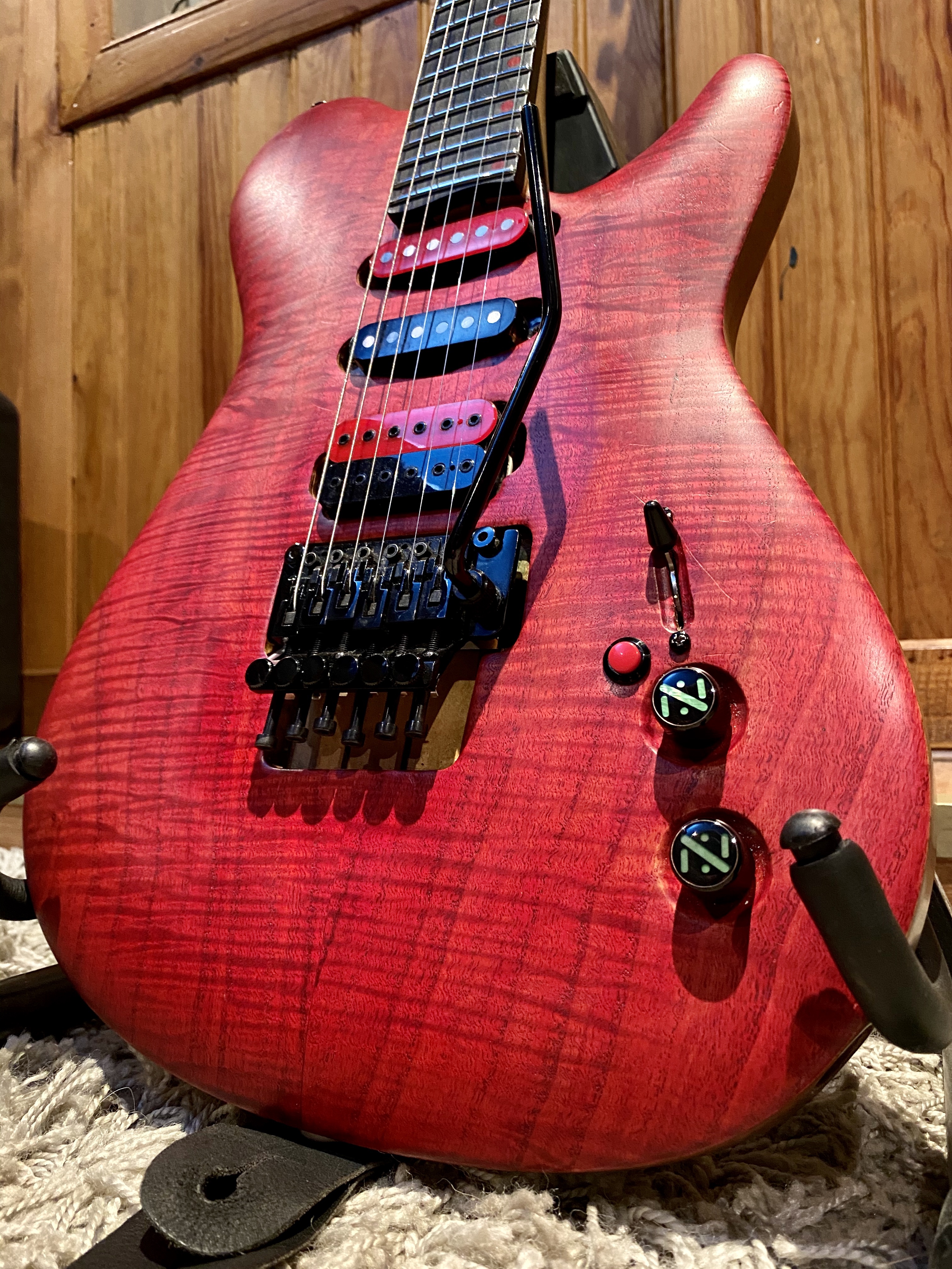 -1 Volume push-pull (split des humbucker en single cool), 1 Tone, 1 sélecteur toggle 3 positions (contacts or), 1 killswitch